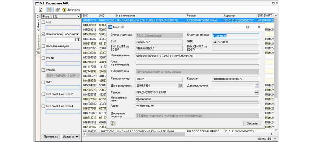 Модуль EDSmart содержит встроенный Справочник БИК, который используется для контроля правильности заполнения соответствующих атрибутов электронных сообщений.